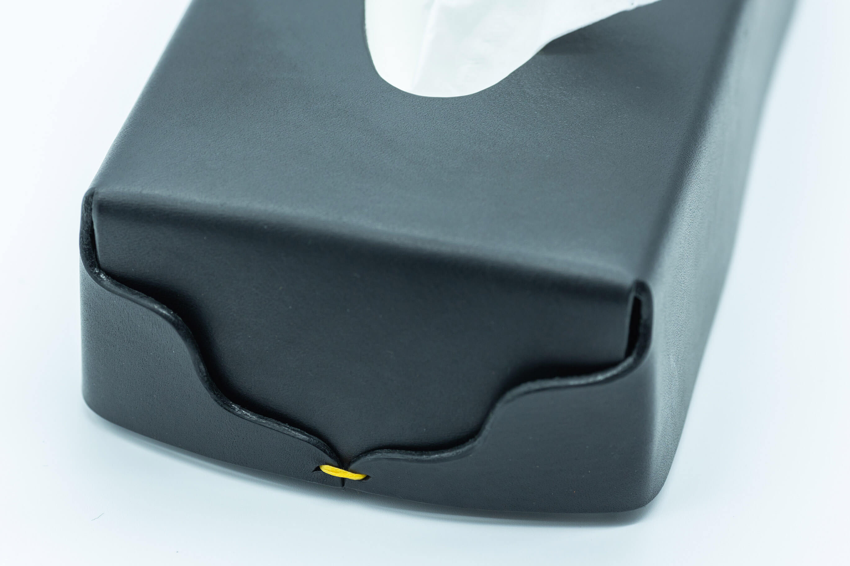 Le noir intense est obtenu grâce à une teinture manuelle au tamponnage qui permet de restituer une couleur qui conserve les différences de teintes du cuir naturel.