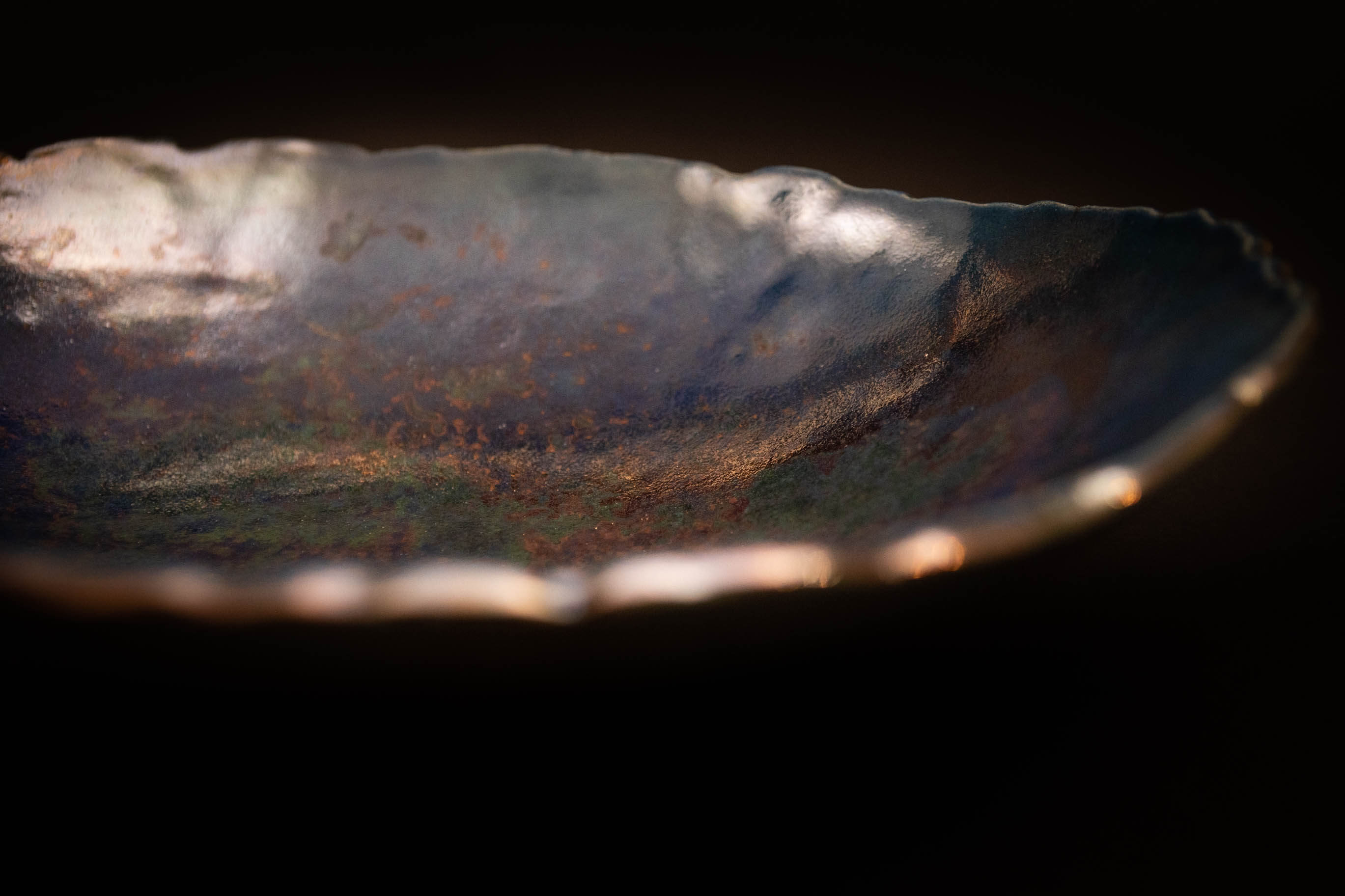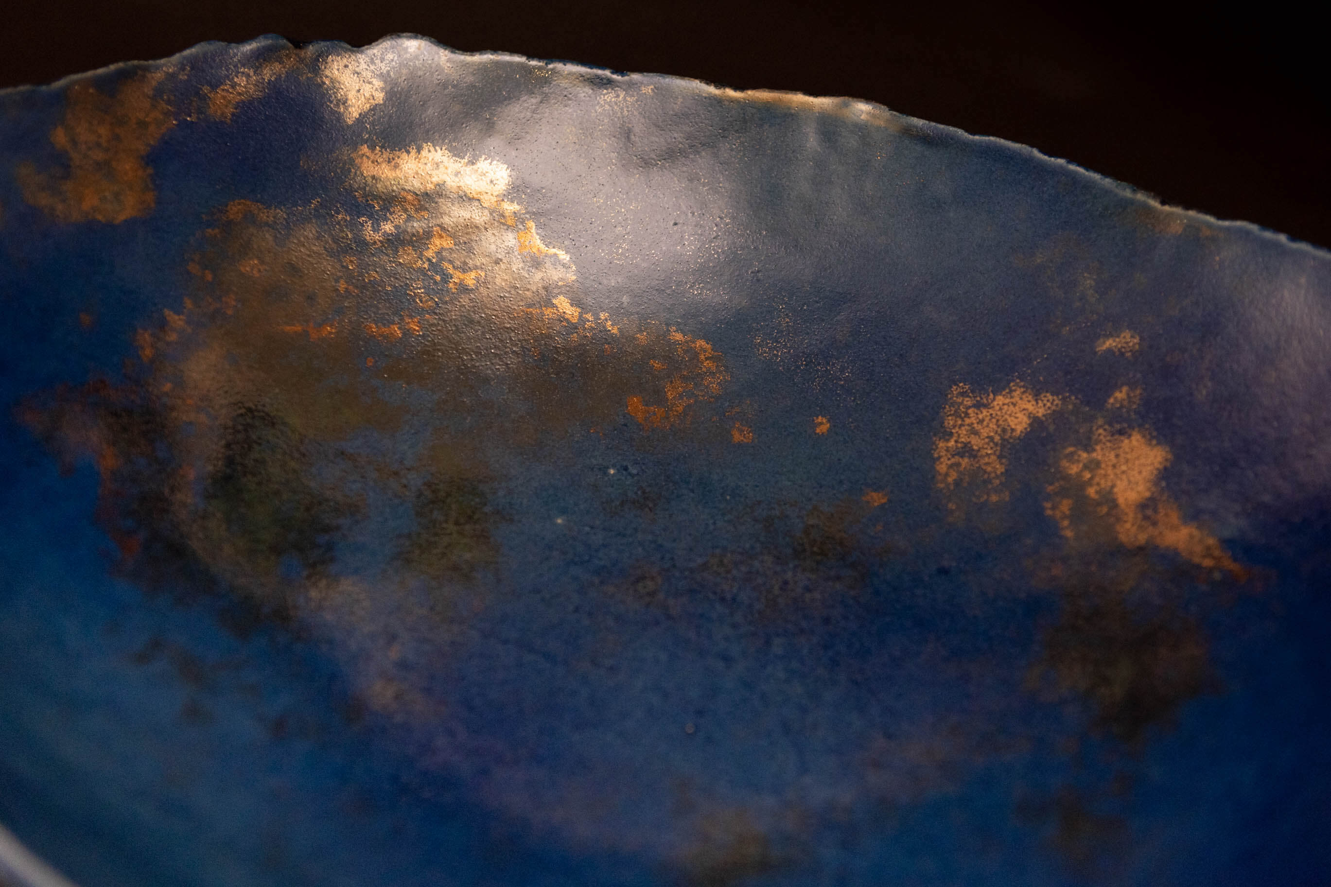 Finition et technique : céramique Raku, émail brillant bleu, oxyde de cuivre avec phase de réduction.