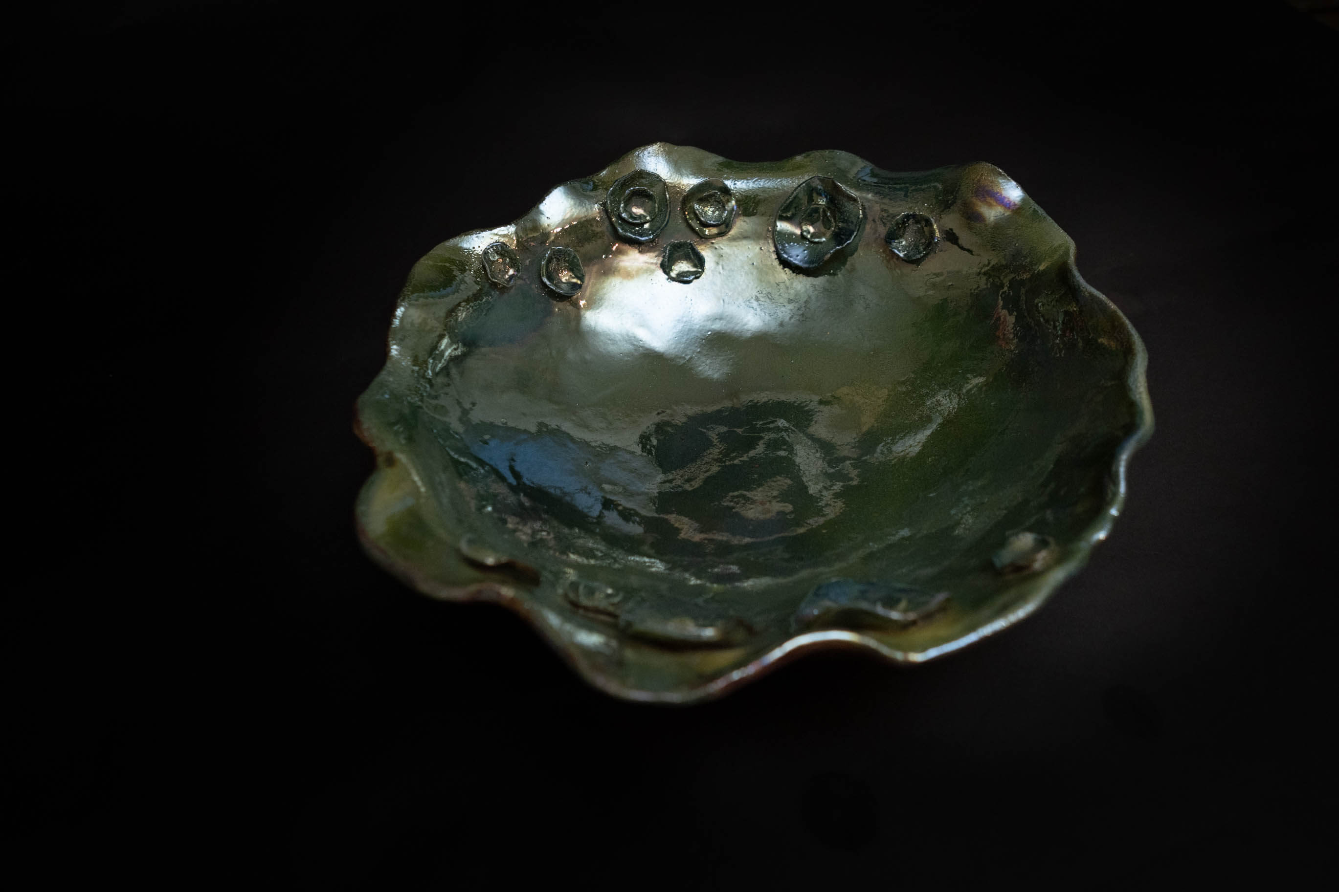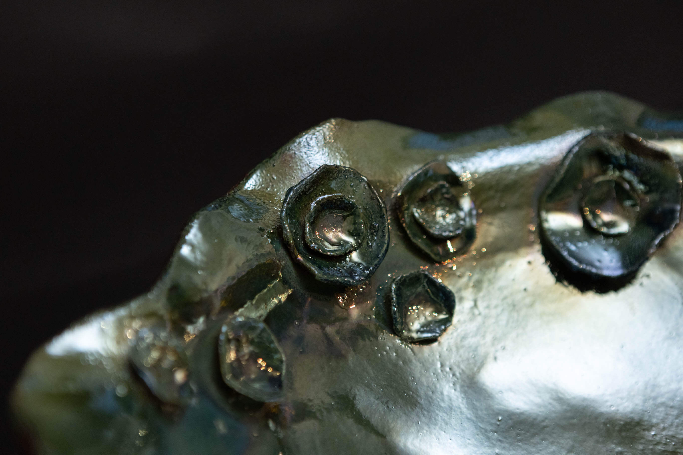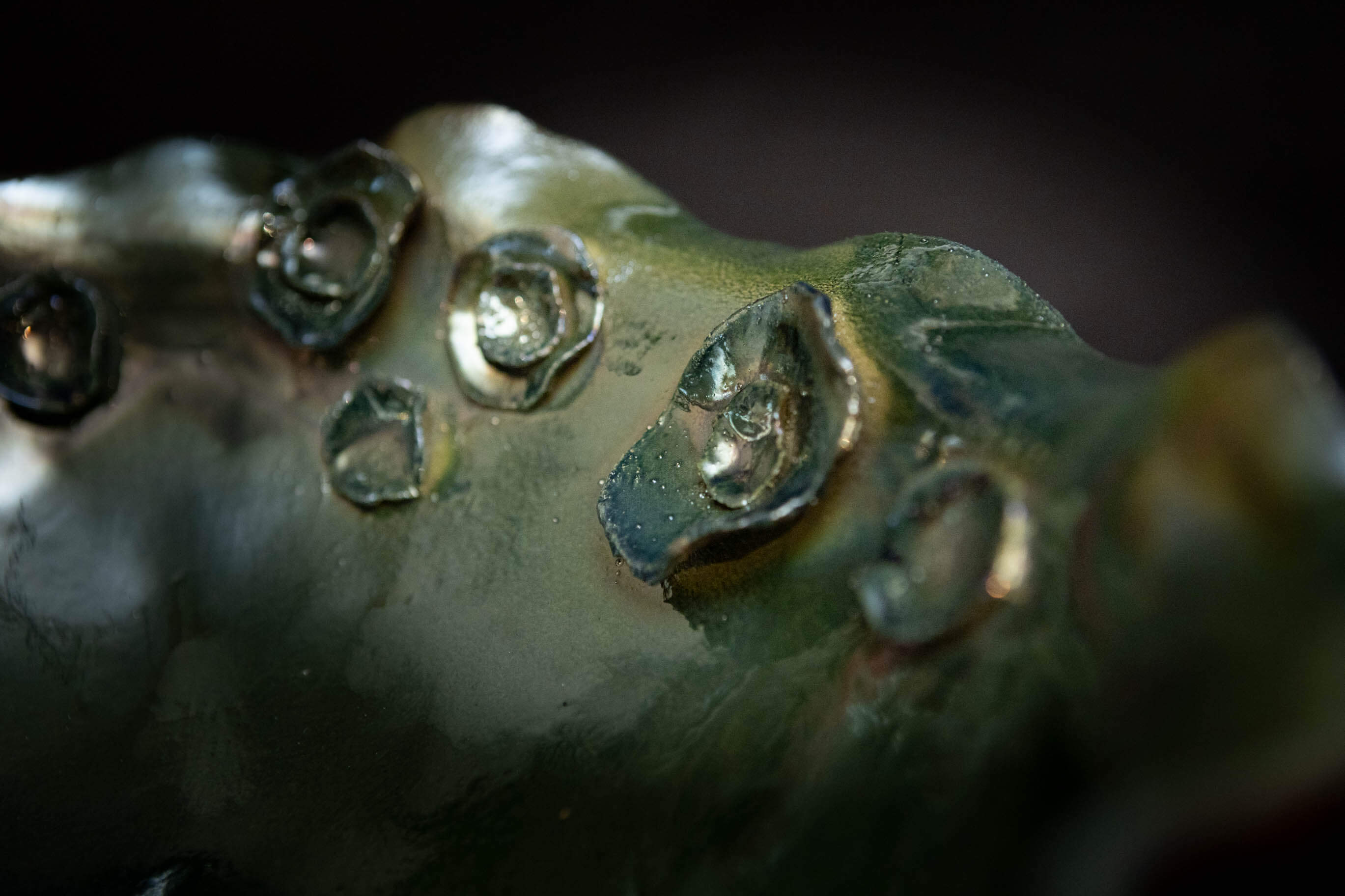 Finition et technique : céramique Raku, émail brillant vert, oxyde de cuivre avec phase de réduction.