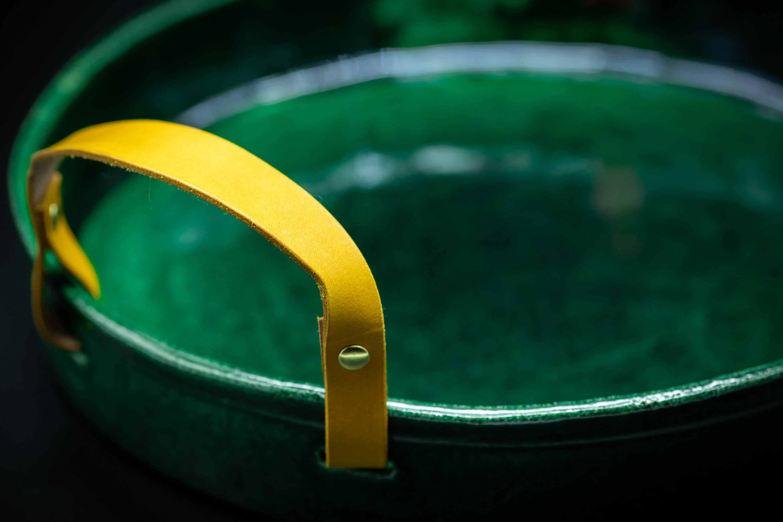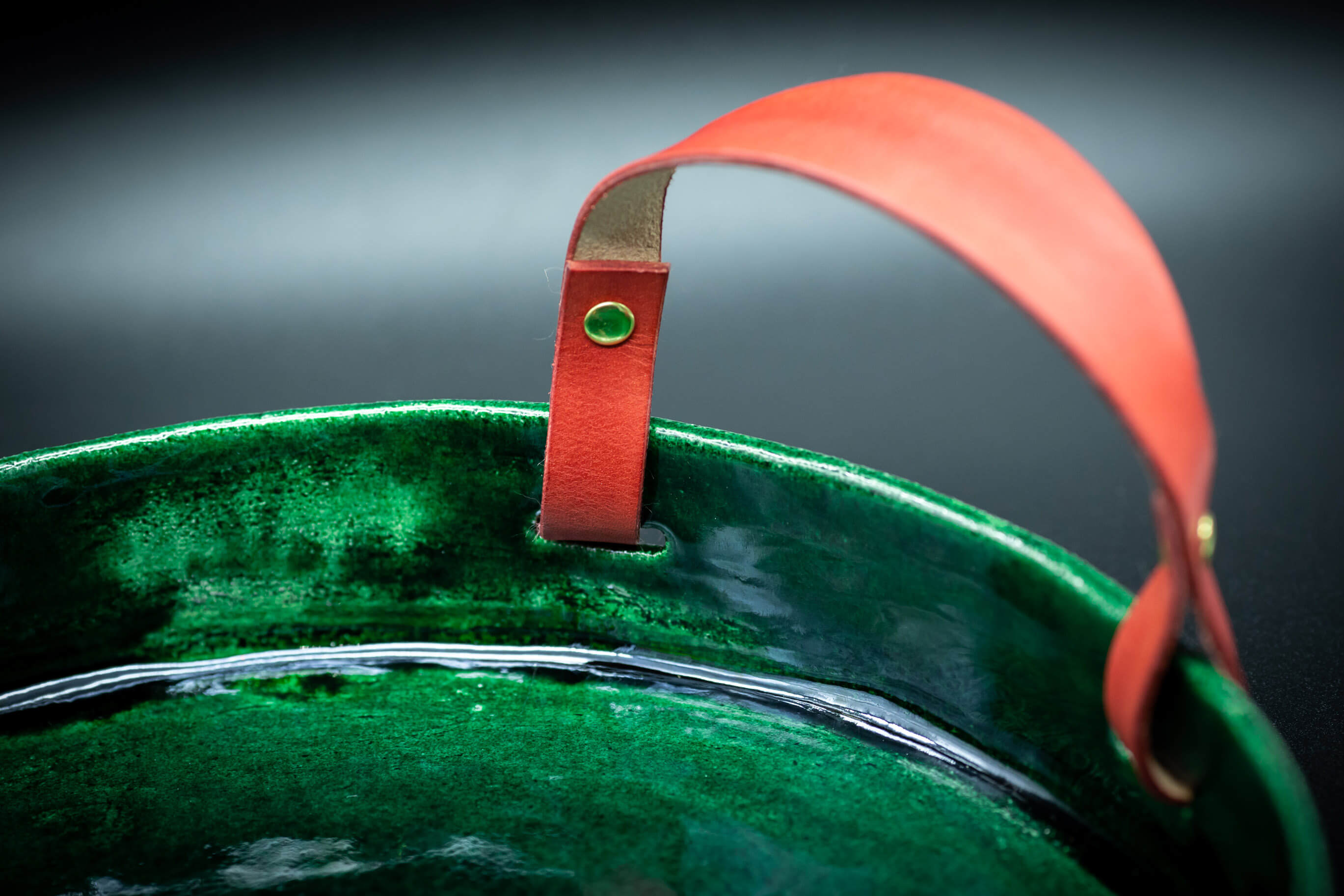 Conçu en céramique Raku écru d'un vert profond, il est paré de deux poignées en cuir végétal de couleur différente, l'une rouge et l'autre jaune. La matière et les couleurs offrent un contraste de caractère unique pour porter en beauté vos objets ou mettre en scène vos décorations préférées sur une table ou une console.