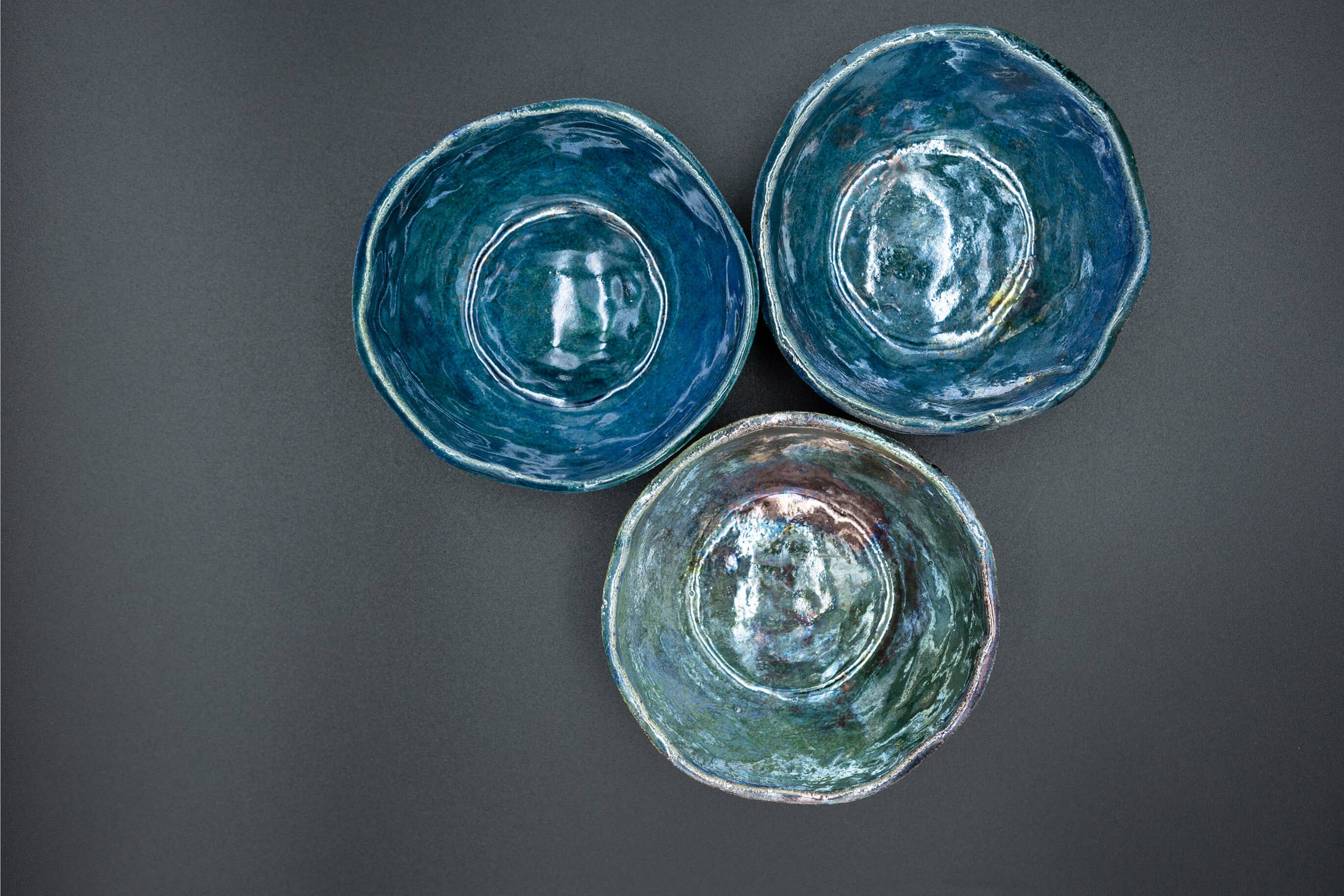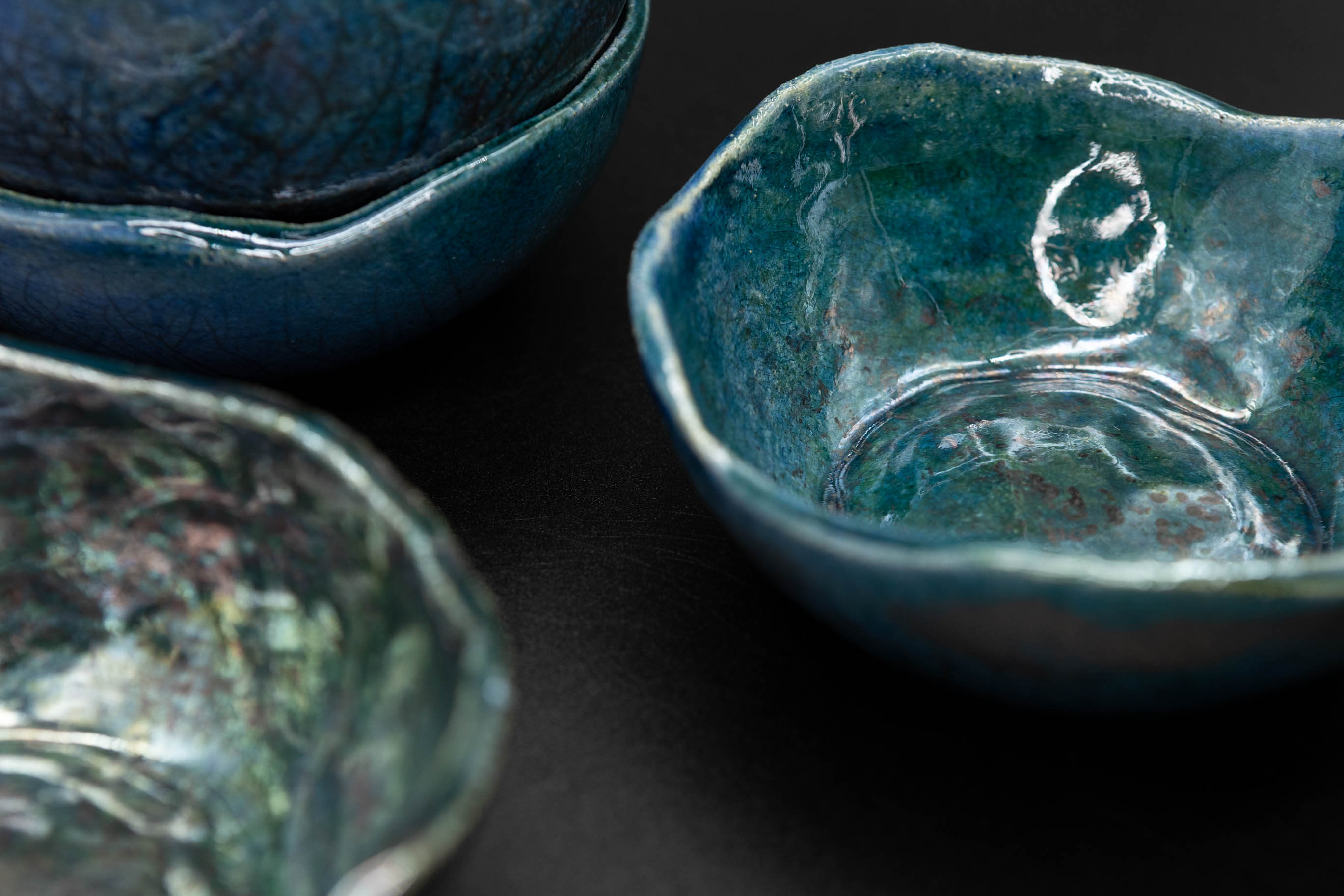 Elaborées entièrement à la main en céramique Raku, elles présentent des reflets différents selon l'endroit où elles sont installées ou la lumière ambiante.
