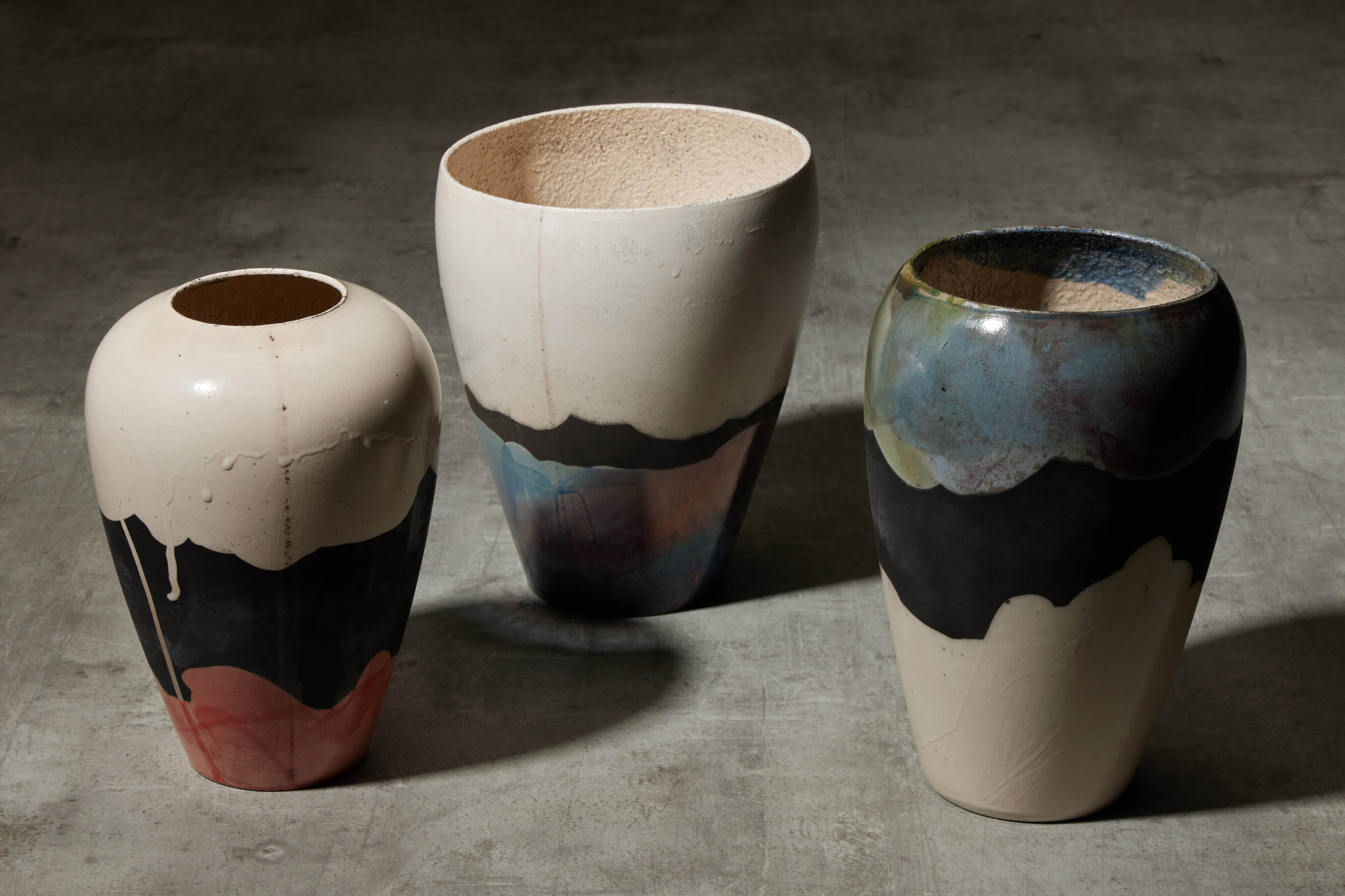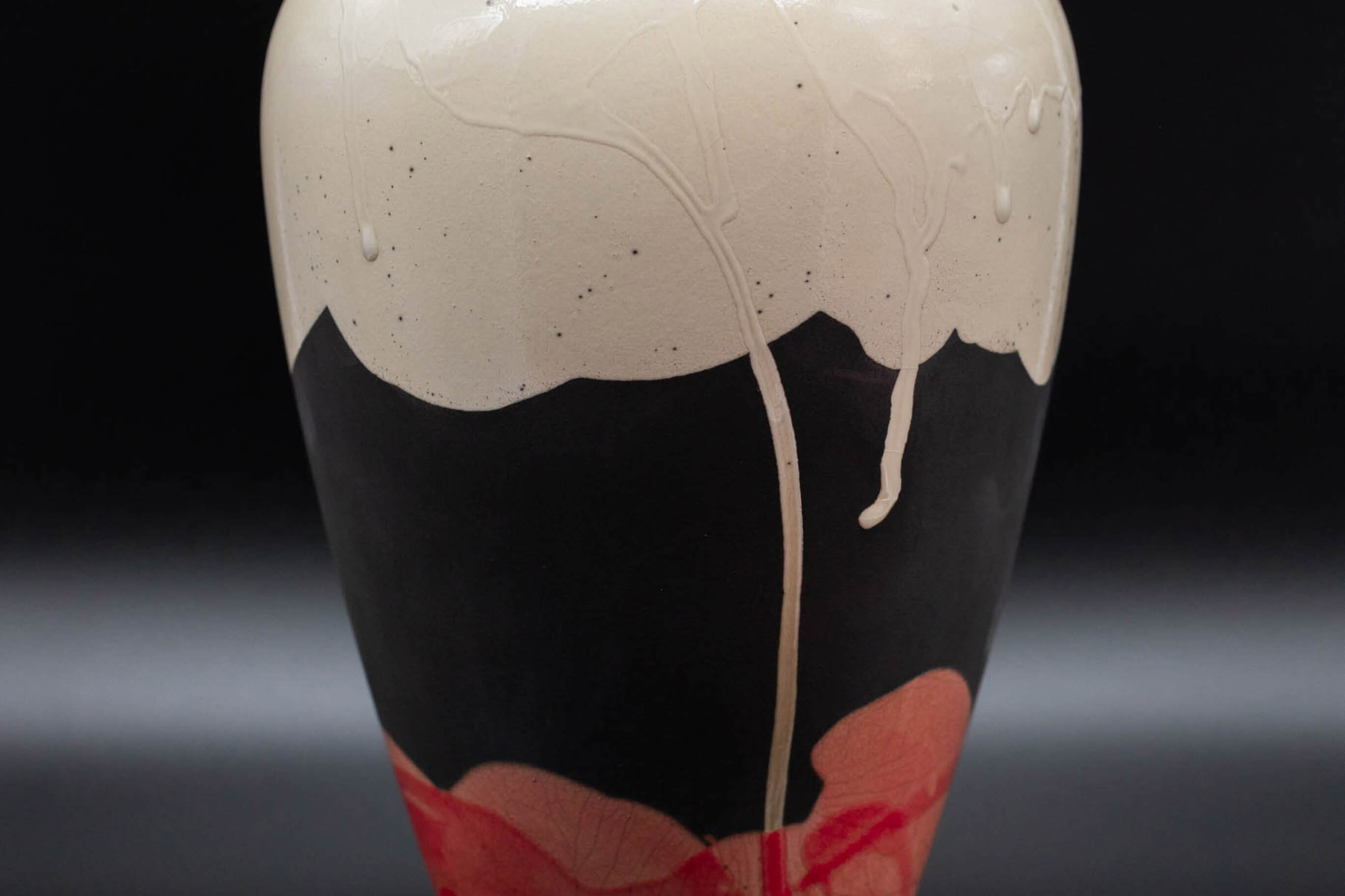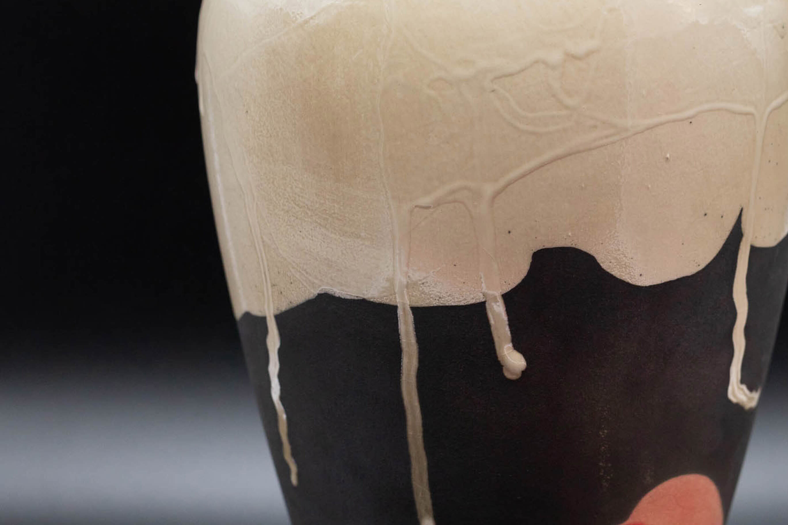 Il étonne par le traitement différent de ses trois couleurs : la partie supérieure écru brillant qui met en valeur la matière, le centre noir mat qui apporte douceur et harmonie et la partie inférieure avec un dégradé de corail craquelé. Ces trois couleurs s'entremêlent très naturellement et permettent presque de deviner les traces du travail manuel de Martina. Son col étroit accueillera des bouquets délicats de fleurs fraiches ou séchées et sera également un objet de décoration à part entière.
