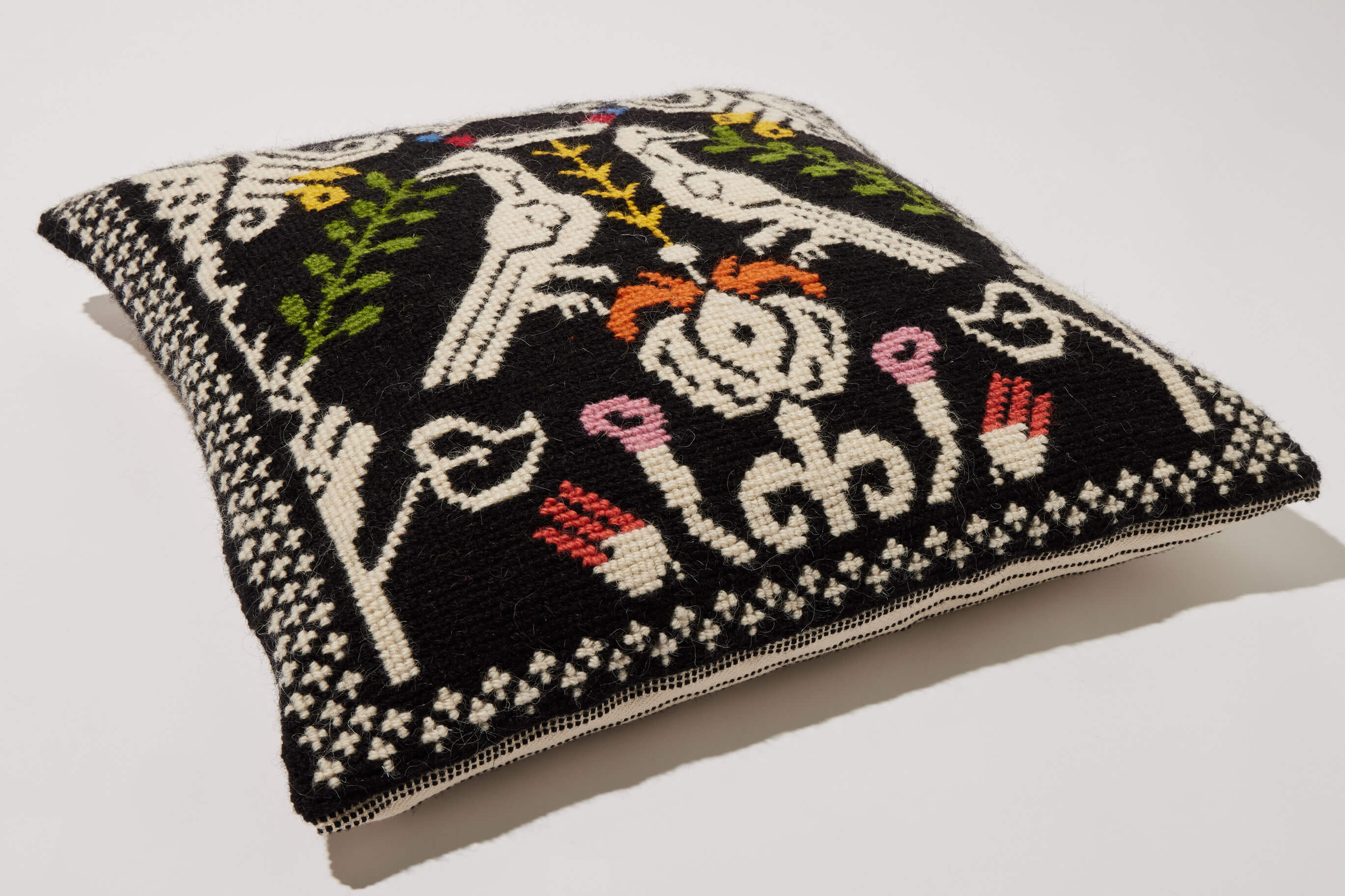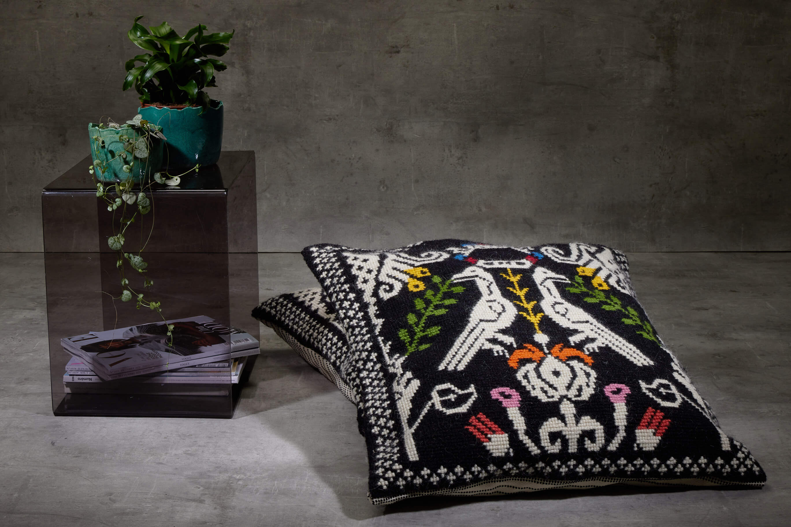 Ce coussin est élaboré à la main grâce à la technique de tissage sarde "a pibiones", qui consiste à produire des motifs en relief, en forme de grain de raisin. Pour Pavoncella, c'est avec le "tutto pieno" (travail plein) aux multiples couleurs que l'oiseau magique est représenté de façon très stylisée. Sa face est conçue en laine de Sardaigne, et son dos en coton, à motif rayé écru et noir.