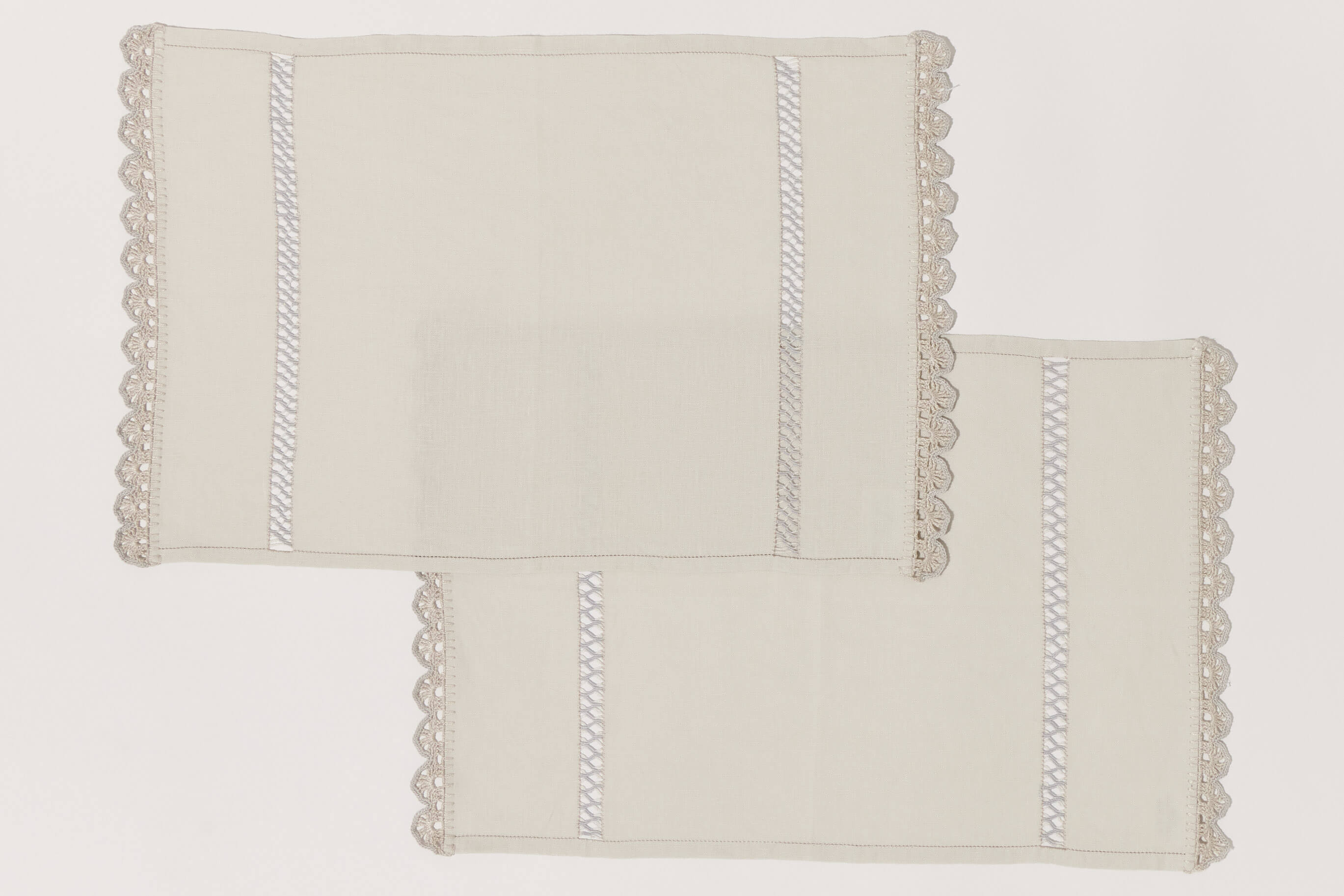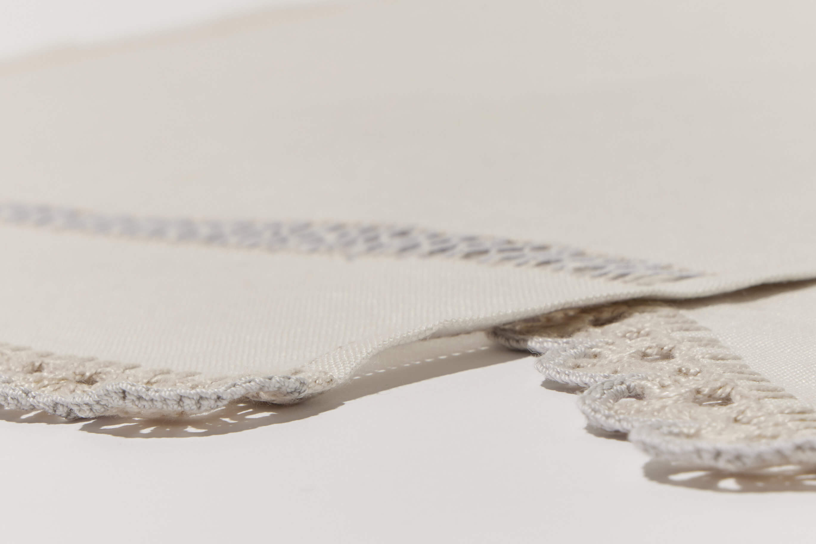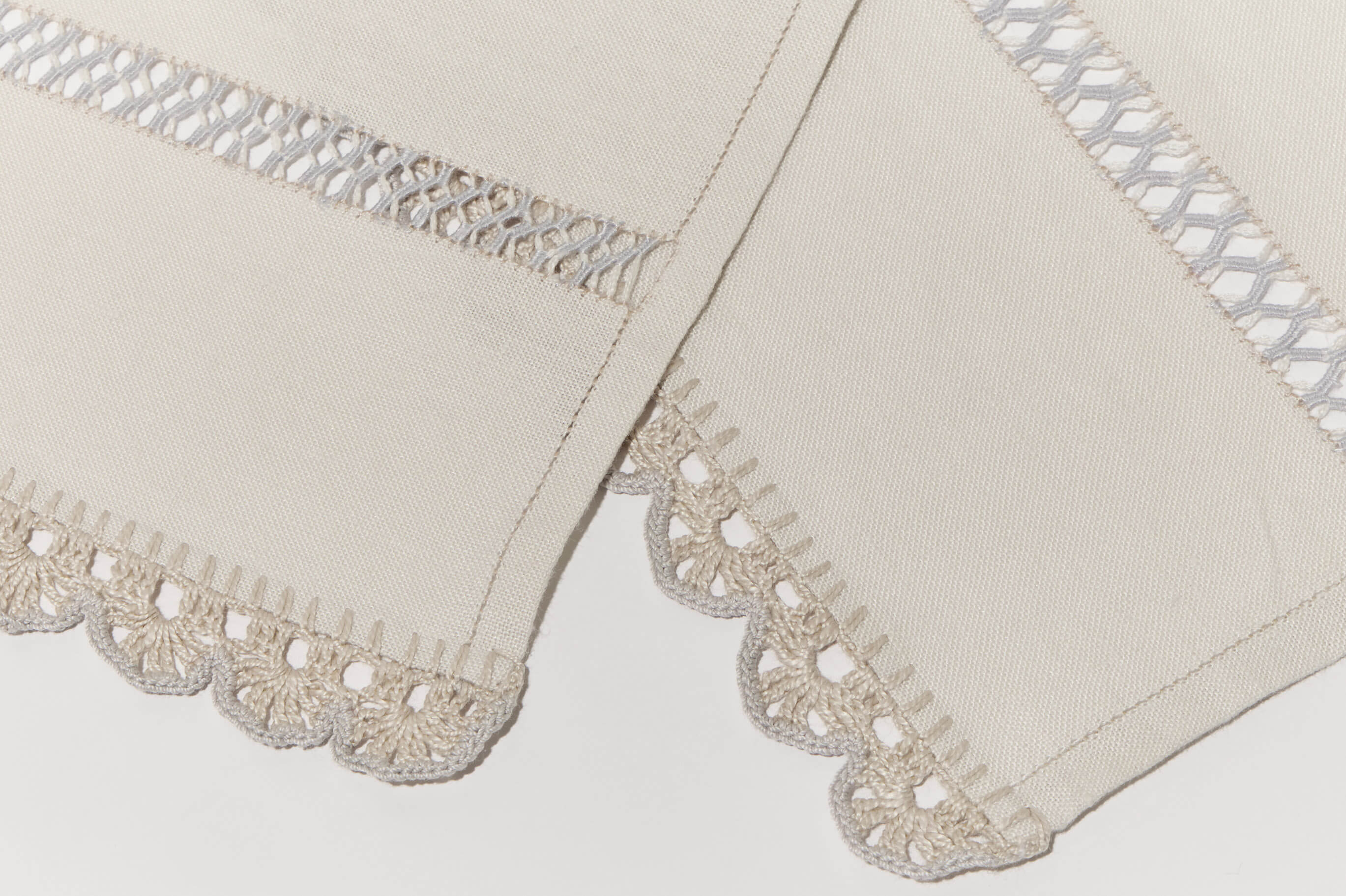 Chaque set du duo Prima Perla est une pièce d'exception qui met en lumière différentes techniques et points de broderie, réalisés avec un mélange de fils beige et gris clair, pour un résultat d'une extrême douceur : bordure et crochet (bordura e uncinetto) sur les côtés, ourlet à jours (orlo a giorno) ainsi que deux bandes d'un très élégant Sfilato bicolore.